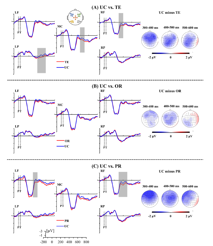 该研究采用延迟匹配范式(matching-to-sample judgment task)考察了中(L1)-英(L2)双语者在加工视觉L2时跨语言正字法(orthography)、语音(phonology)和语义(semantics)信息自动激活的时间动力学特征。脑电数据结果证明,中(L1)-英(L2)双语者在加工L2时跨语言词汇-语义(lexical-semantic)信息激活表现在300-600 ms的时间窗内(即经典的N400成分);进一步地,脑电数据也表明,在词汇层面(lexical level)上,中(L1)-英(L2)双语者在加工L2时自动激活了跨语言的语音信息(phonology),而非正字法(orthography)信息表征。脑电数据结果如下图所示: