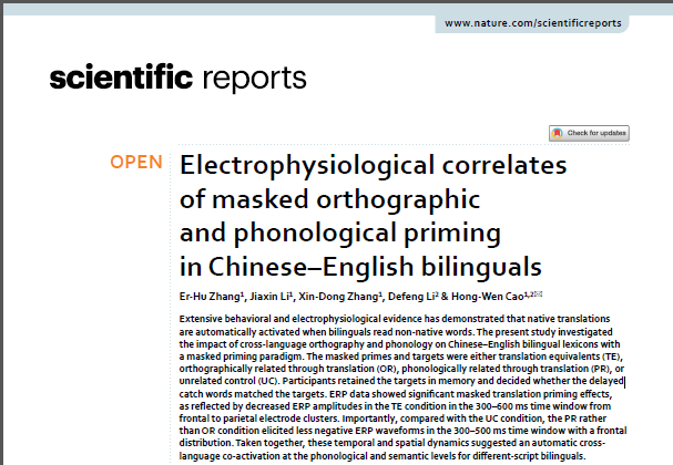 曹洪文老师团队在英国Nature出版集团(NPG)旗下综合性科学期刊《Scientific reports》(MULTIDISCIPLINARY SCIENCES, SCIE, IF:4.996, Q2)上在线发表题为“Electrophysiological correlates of in Chinese–English bilinguals”的研究论文。该论文第一作者为澳门美高梅赌场