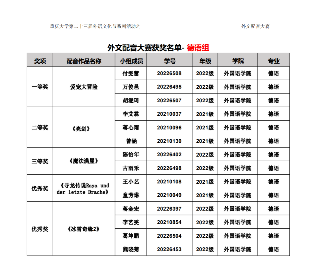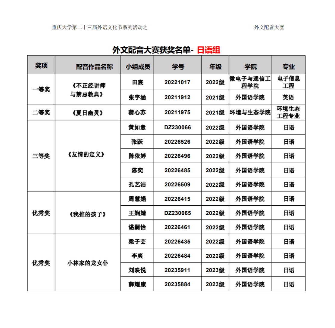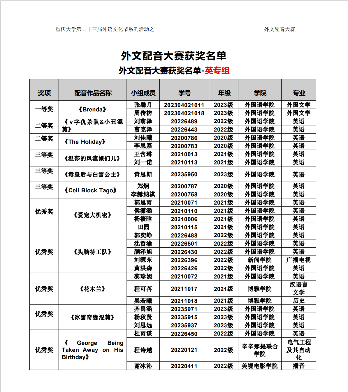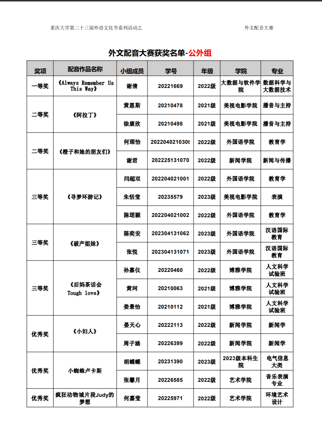 由重庆大学主办、澳门美高梅赌场-美高梅网上赌博 承办的重庆大学第二十三届外语文化节系列活动之外文配音大赛已经结束。赛事自11月18日启动以来,吸引到全校多支队伍前来参与,评选出31个获奖组。其中,英语专业组共11个获奖组29名获奖选手,公共外语组共9个获奖组18名获奖选手,日语德语组共10个获奖组29名获奖选手。 现将外文配音大赛获奖名单进行公布。