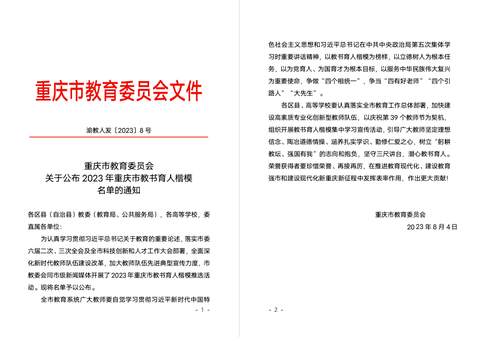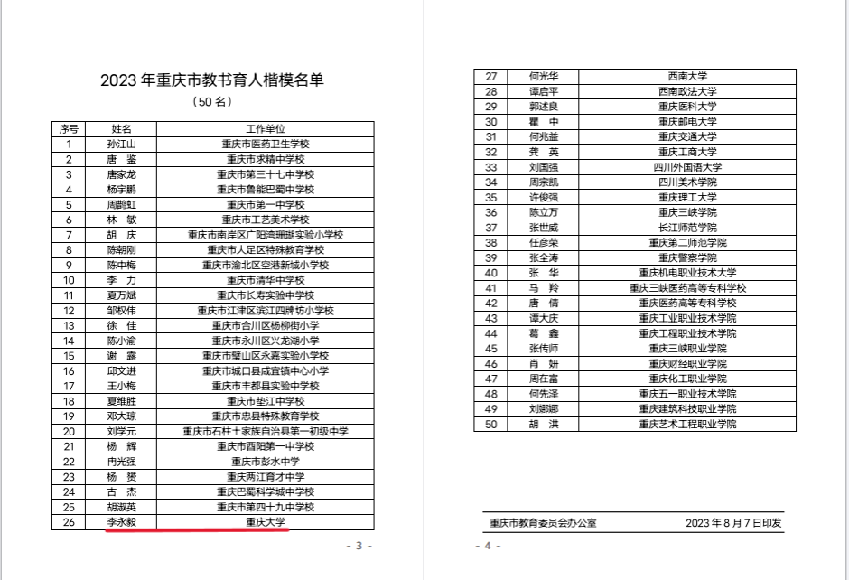 李永毅教授荣获重庆市教书育人楷模称号!