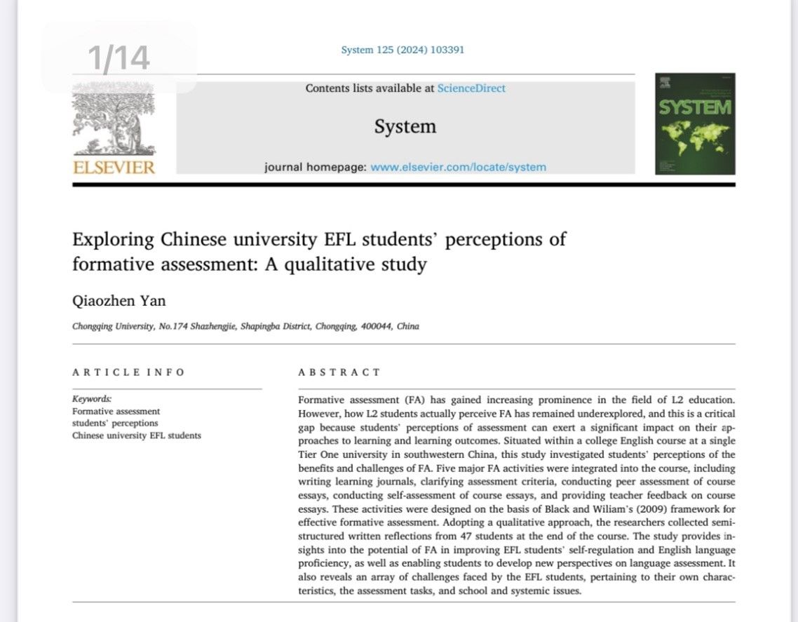青年教师颜巧珍在语言学类SSCI期刊System发表学术论文。该论文题目为 Exploring Chinese University EFL Students’ Perceptions of Formative Assessment: A Qualitative Study,颜巧珍老师为论文唯一作者,论文受重庆大学中央高校基本科研业务费项目资助(项目号为2023CDJSKJC04)。