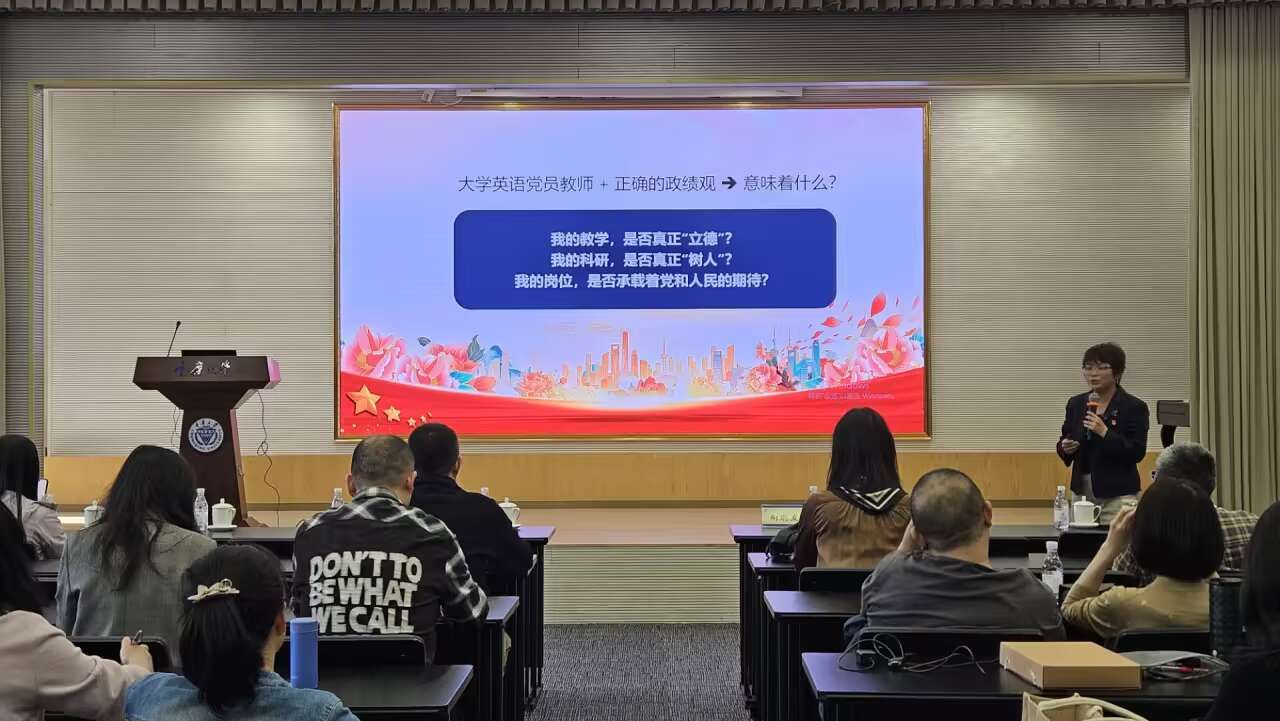 2026年4月17日,大学英语第一教工党支部和第二教工党支部开展了“树立和践行正确政绩观”的专题学习,学院党委书记李小辉以《新时代高校英语教师党员的正确政绩观培育与践行--从“教书育人”到“立德树人”的政绩自觉》为主题,为两个支部党员讲授党课。
