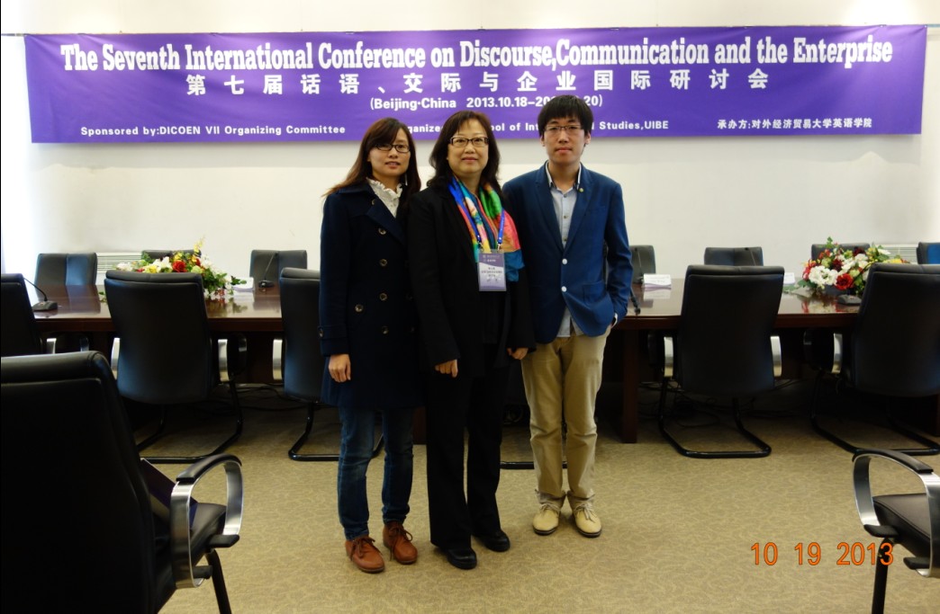 黄赟琳副教授带领硕士研究生许寅、李森参加了由对外经贸大学于2013年10月19-20日举行的“第七届话语、交际与企业国际研讨会”(The Seventh International Conference on Discourse, Communication and Enterprise VII , DICOEN VII)。本届大会首次在中国大陆举办,来自美国、英国、德国、意大利、澳大利亚、挪威、日本、新加坡、马来西亚共计九个国家以及香港、台湾地区、中国大陆的近70名专家学者参加了本次会议。