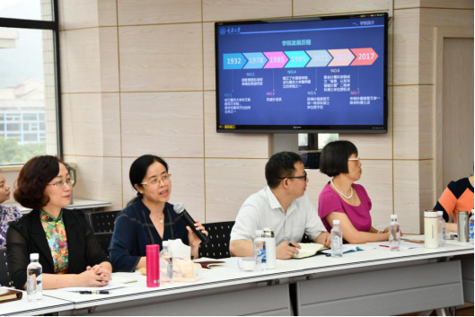的发展历程后,深入分析了第四轮学科评估和申报外国语言文学一级学科博士点时存在的问题,并对标华中科技大学,指出学科发展的差距和不足,提出了学院学科发展目标、建设思路和实施举措。汇报中还同时强调了重庆大学大学外语教育将继续深化改革,积极服务于学校“双一流”建设,打造良好的外语生态,支撑师生国际交流服务。