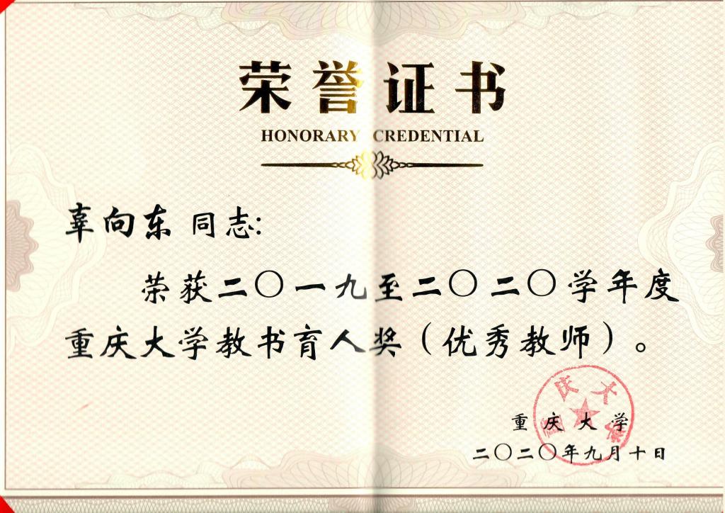 辜向东教授荣获重庆大学2019-2020学年度教书育人奖(优秀教师)。