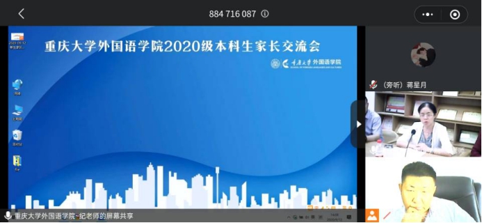 下午14:00,2020级本科生家长见面会正式举行,欧玲书记致欢迎辞,表达了对家长的感谢,感谢家长对重大外院的信赖和支持,对在疫情期间努力学习并成功考入外院的新生表示祝贺和欢迎。