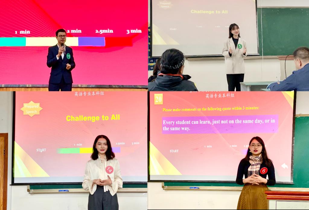我校的各位选手在“Challenge to All”的定题演讲中,展现出自己强大的说理论述能力与知识储备,或以时事热点为出发点,或例举名人轶事,或结合专业领域,围绕如何直面问题、迎接挑战等方面展开演讲,掷地有声地来表达自己的态度。在以名言名句为话题的即兴演讲中,他们各展其才,从不同角度有新意、有深度地扣题阐述,让人眼前一亮。面对犹未可知的两个外教提问,选手们更是不惧挑战,凭借扎实的语言应用功底、标准的发音以及机智敏锐的回答,赢得满堂彩。