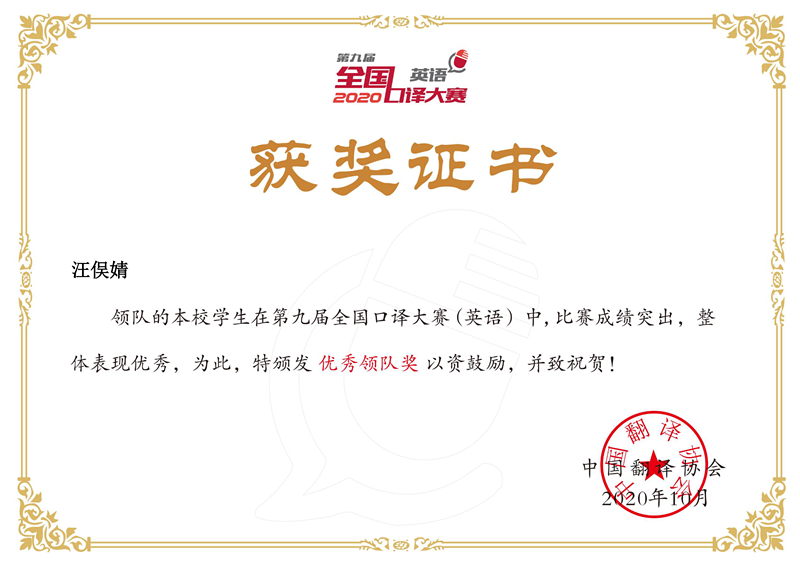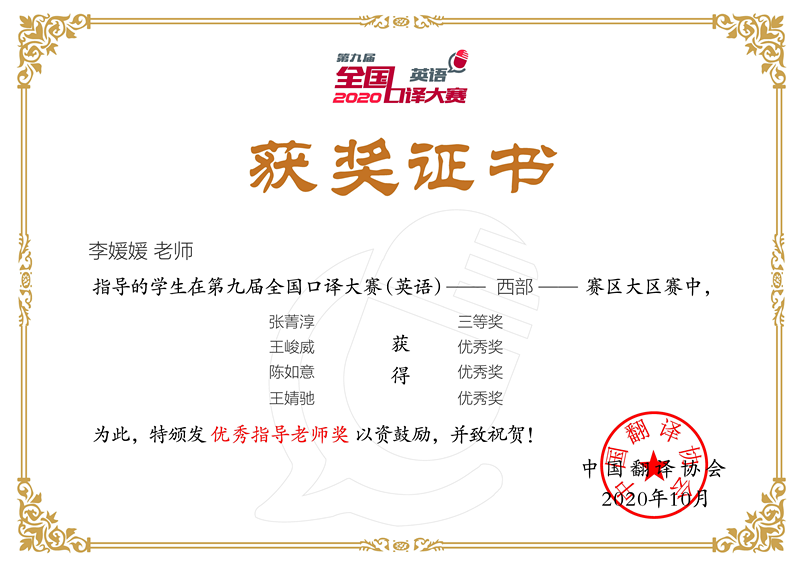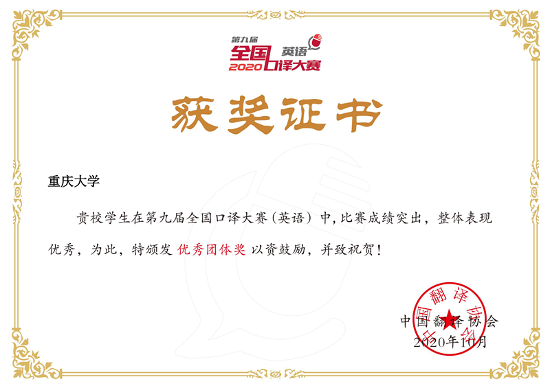 近日,随着第九届全国口译大赛(英语)大区赛的结束,中国翻译协会就我校学子在赛事各阶段的优秀表现,为重庆大学颁发了优秀团体奖,为赛事指导老师李媛媛颁发了优秀指导老师奖,为赛事领队老师汪俣婧颁发了优秀领队奖。