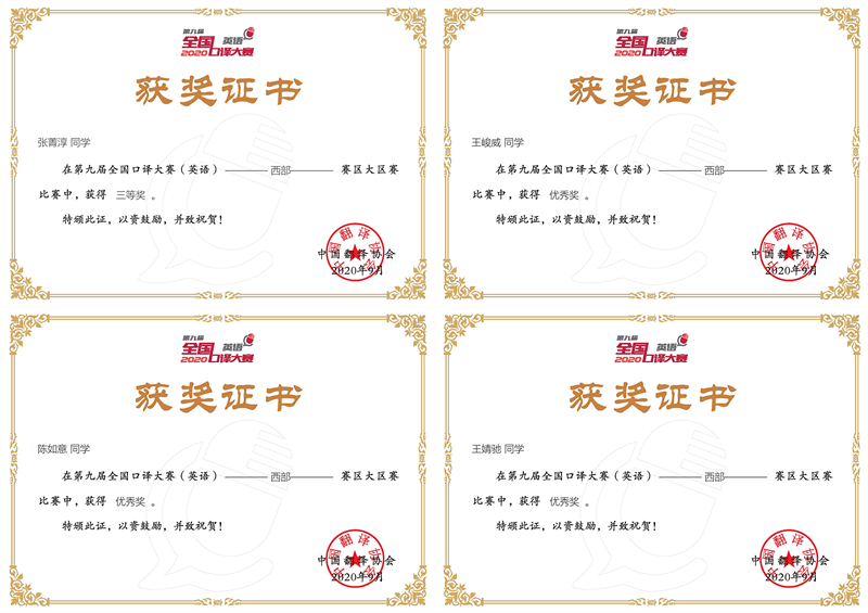 第九届全国口译大赛(英语)从初赛至大区赛三个阶段,遵循国家疫情防控大方针要求,全程实行线上选拔与参赛,历时4个月,我校累计评获奖31项。在校初赛阶段,我校从报名的100多人中筛选出57人参加比赛,评选出14名获奖选手,并从中推选出11名学生参加省市级复赛;在复赛中,荣获一等奖的2位选手和荣获二等奖的3位选手又凭借突出表现晋级至大区赛。在整个竞赛过程中,选手们获得个人奖项的同时,也为重庆大学赢得了团体荣誉。这是对我校参赛选手突出表现的认可,是对站在选手身后给予指导与帮助的老师们工作上的肯定,也是我校在英语口译赛事中正式迈出一大步的重要见证,更能直接地鼓励我校广大学生参与到英语口译竞赛中来。