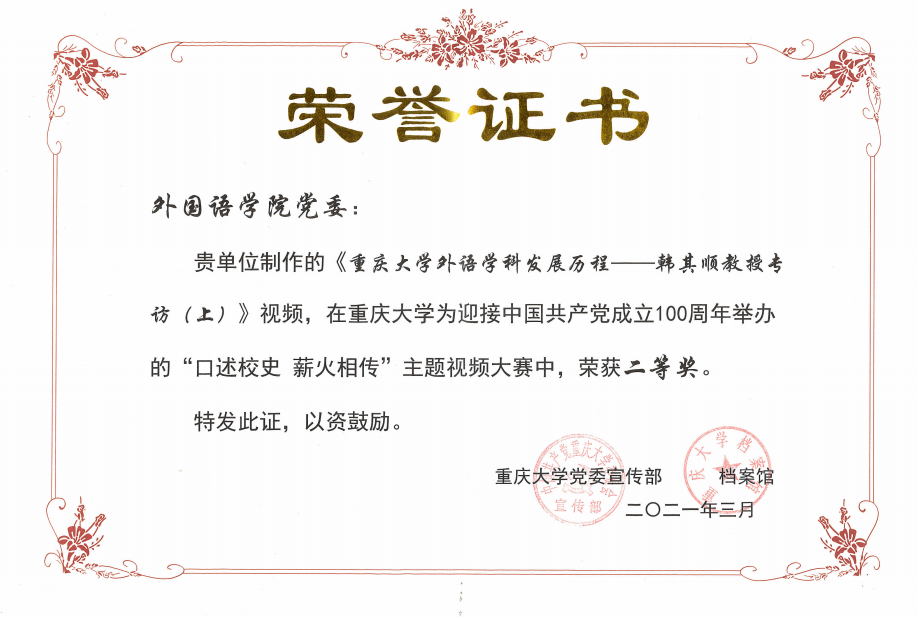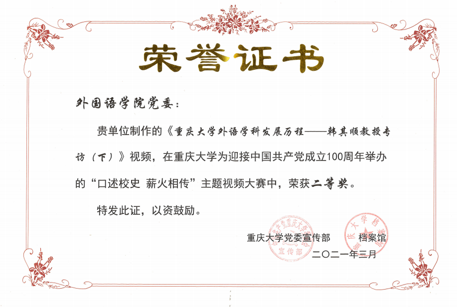 《重庆大学外语学科发展历程—韩其顺教授专访(上下)》两则参赛作品获得大赛二等奖。