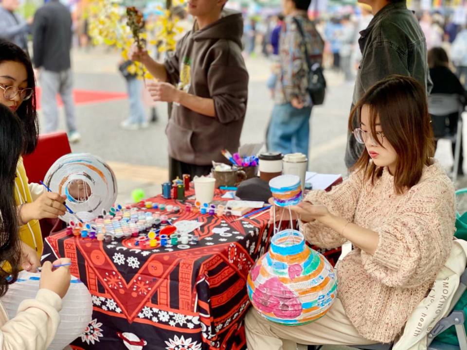 舞台节目演出的同时,台下各个展棚的活动也正热火朝天地进行着。本次异国文化风情展共设有十二个展棚,分别代表冰岛、日本、西班牙、意大利、俄罗斯、土耳其、德国、挪威、法国、韩国、印度、泰国等十二个国家。同学们在冰岛展棚现场体验模拟极光,在西班牙展棚穿上西班牙民族特色服装留影纪念,在德国展棚享受黑啤与香肠,在俄罗斯展棚品尝着格瓦斯和大列巴……各个国家展棚都准备有趣味文化体验小游戏和民族特色美食,让参展的同学在娱乐之中了解到更多其他国家的文化风情与民族特色。