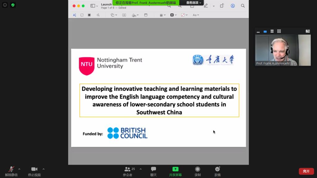作为联合项目的英方主持人,Frank Austermuehl为大家详细讲解了项目的基本概况,双方团队主要成员,立项背景和意义,前期已经形成的共识,后期项目发展及预期项目成果。重庆大学外国学院欧玲书记在发言中强调,学院非常重视乡村振兴工作,期望通过该项目能够促进乡村和欠发达地区中小学英语教师的发展,同时也可以大力提高澳门美高梅赌场