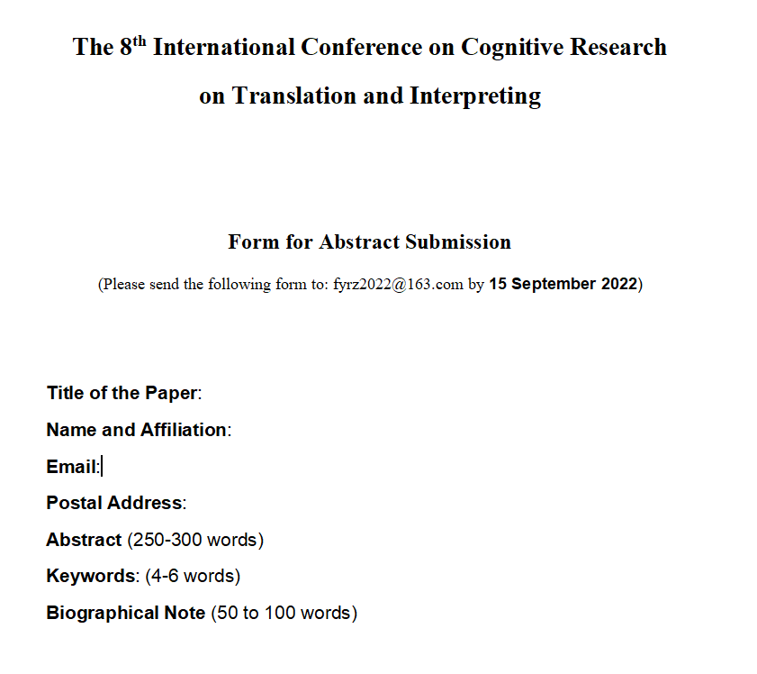 We invite papers on one of the conference themes or related topics in cognitive translation studies. The language of the conference will be English. The submission deadline is 15 September 2022. Intended participants will fill in the form (including abstracts, participant’s names, affiliation and contact information) and submit to the conference email: [email protected].