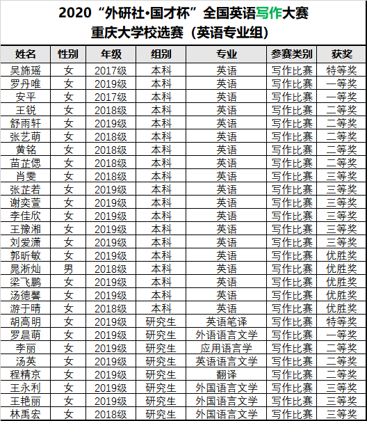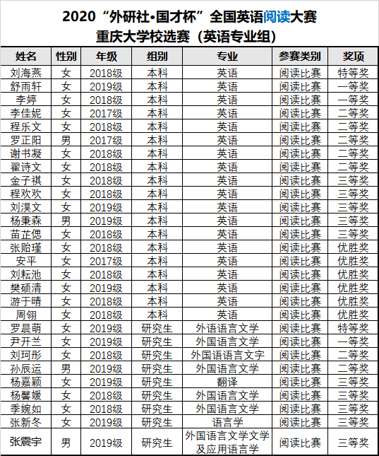 9月30日,2020年“外研社·国才杯”全国英语写作、阅读大赛重庆大学英语专业本科组、英语专业研究生组校选结果出炉。两大赛事经由英语竞赛团队老师出题、阅卷以及评审等环节,最终评定出50名奖项。在写作比赛中,本科组共评选出特等奖1名、一等奖2名、二等奖5名、三等奖6名、优胜奖5名,研究生组共评选出特等奖1名、一等奖1名、二等奖3名、三等奖3名;在阅读比赛中,本科组共评选出特等奖1名、一等奖2名、二等奖5名、三等奖6名、优胜奖5名,研究生组共评选出特等奖1名、一等奖1名、二等奖3名、三等奖3名。具体结果公示如下: