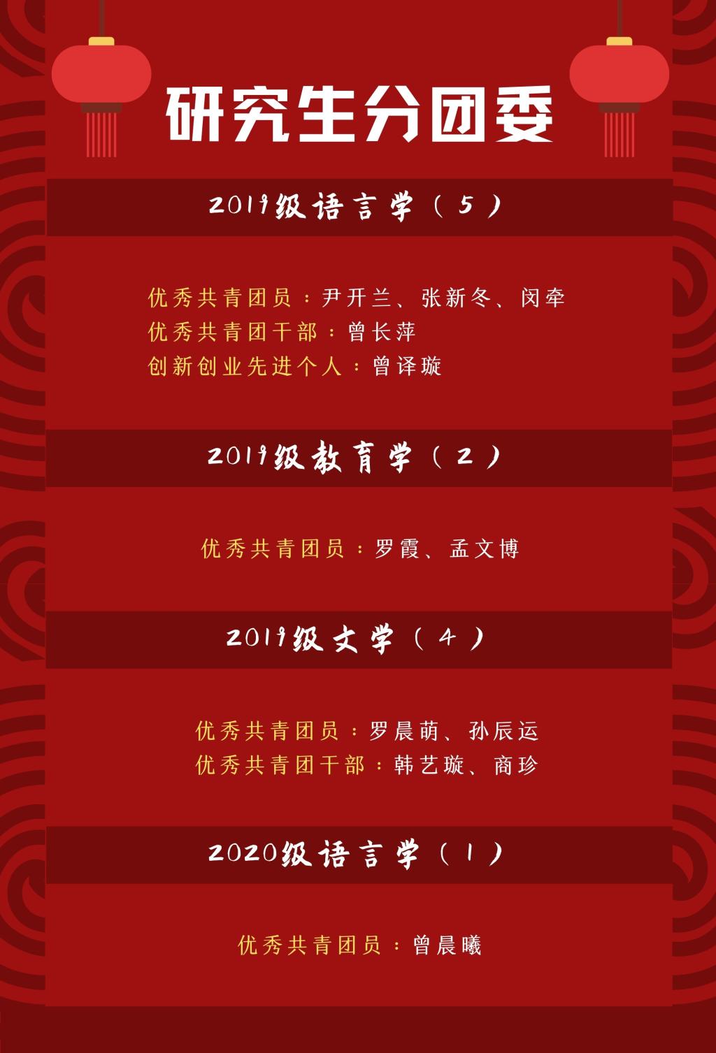 研究生分团委共获得12项荣誉,2019级语言学专业获5项个人荣誉,2019级教育学专业获2项荣誉,2019级文学专业获4项个人荣誉;2020级语言学专业1项荣誉。