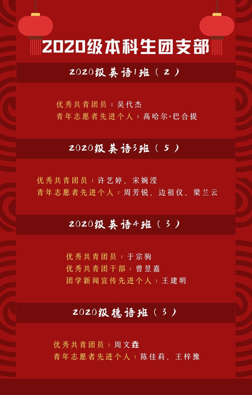 2020级本科生团支部共获得13项荣誉。2020级英语一班团支部获得个人荣誉2项;2020级英语三班团支部获得个人荣誉5项,2020级英语四班团支部获得个人荣誉3项,2020级德语班团支部获得个人荣誉3项。