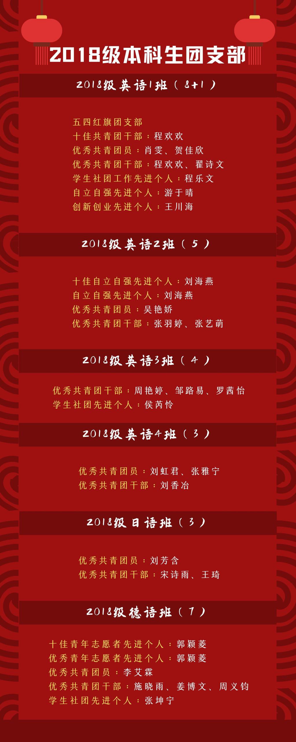 2018级本科生团支部累计获得31项荣誉。2018级英语一班团支部被评为“五四红旗团支部”,累计获得个人荣誉8项;2018级英语二班团支部累计获得个人荣誉5项;2018级英语三班团支部获得个人荣誉4项;2018级英语四班团支部获得个人荣誉3项,2018级日语班团支部获得个人荣誉3项,2018级德语班团支部累计获得个人荣誉7项。