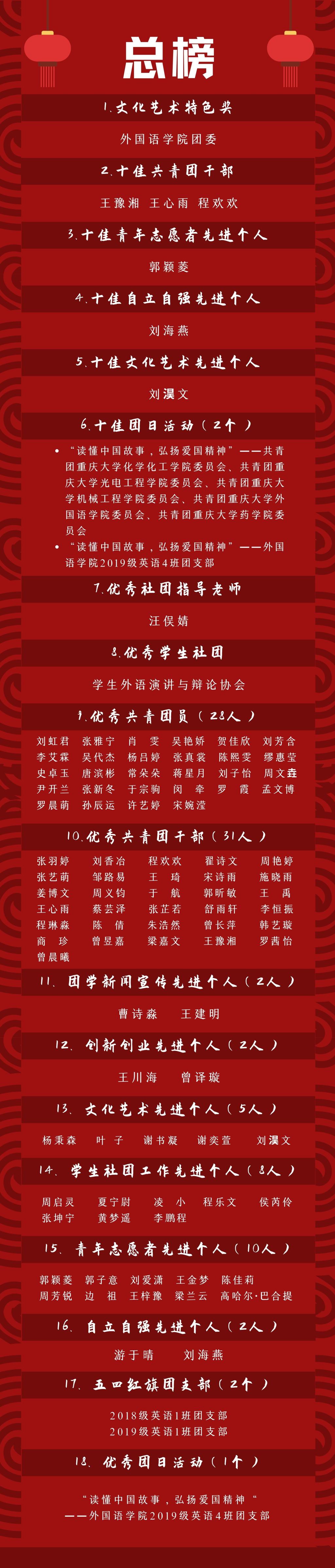团委被授予“文化艺术特色奖”,校级A等社团外语演讲与辩论协会被评为“优秀学生社团”,团委书记汪俣婧老师获优秀社团指导老师。五四红旗团支部2个、优秀团日活动1个。“十佳”类奖项8个,十佳共青团干部3人,十佳青年志愿者先进个人、十佳自立自强先进个人和十佳文化艺术先进个人各1人,十佳团日活动2个。优秀共青团员28人、优秀共青团干部31人、团学新闻宣传先进个人2人、创新创业先进个人2人、文化艺术先进个人5人、学生社团工作先进个人8人、青年志愿者先进个人10人、自立自强先进个人2人。