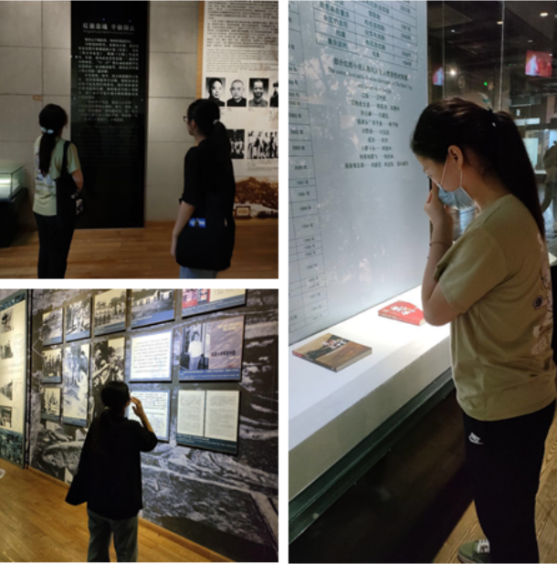 在所有展区中,最令实践团成员们震撼之处,莫过于“11·27”大屠杀半景画馆了。此馆主要展出的是通过现代技术复原的“11·27”大屠杀现场壁画,在壁画底部还通过玻璃走廊展示了于大屠杀牺牲的先烈们的遗物和现场的残骸。走在此处,眼观壁画,每一步、每一眼都显得格外沉重。壁画无声,却庄严有力地向每一个游客诉说着那一段充满鲜血与泪水地岁月,警示着我们勿忘历史,负重前行。