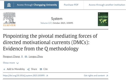 常鹏云老师团队在国际期刊System(IF: 6,SSCI语言学Q1)发表题为“Pinpointing the pivotal mediating forces of Directed Motivational Currents (DMCs): Evidence from the Q methodology”学术研究论文。常鹏云博士为论文第一作者及通讯作者,论文合作者为其指导硕士研究生周龙宇。