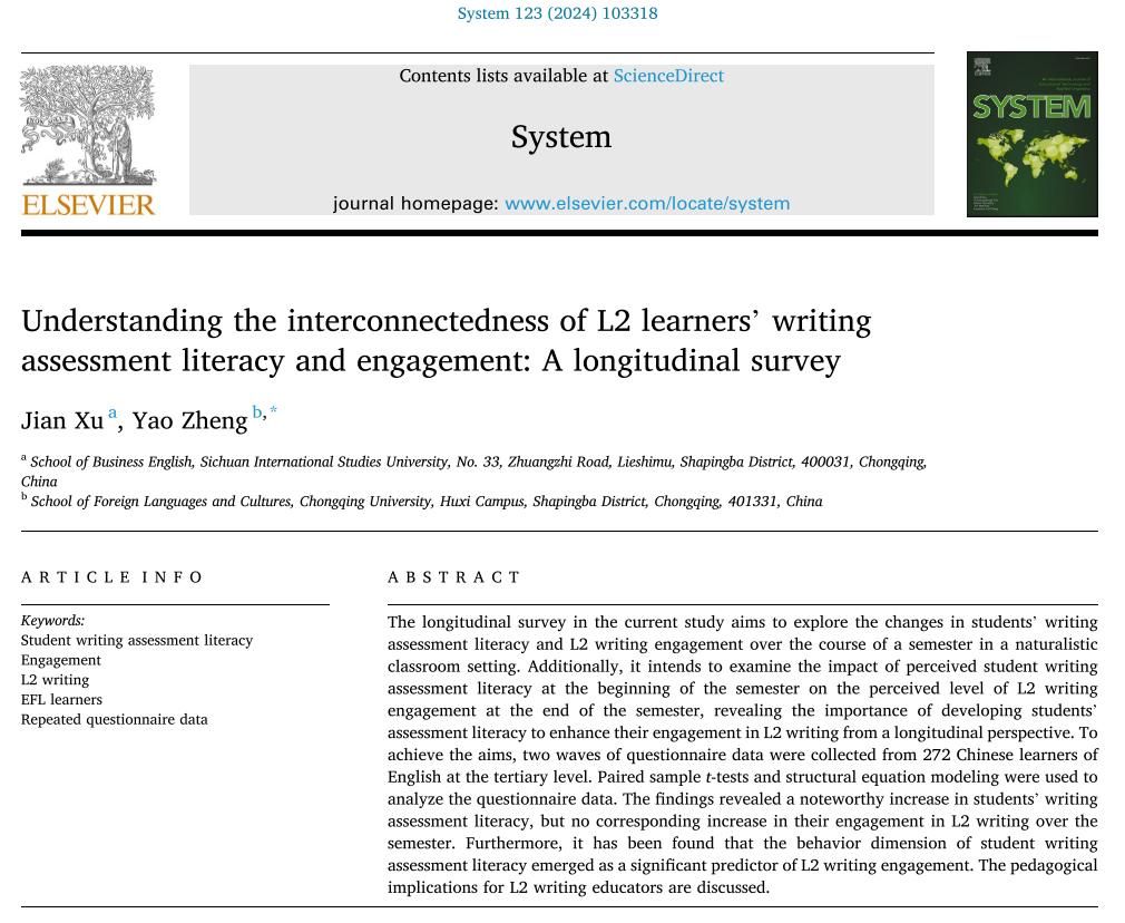 教师郑尧与四川外国语大学徐建教授共同在语言学领域的顶尖期刊——SSCI一区期刊System上发表了题为“Understanding the interconnectedness of L2 learners’ writing assessment literacy and engagement: A longitudinal survey”的学术论文。郑尧担任通讯作者,重庆大学为通讯作者单位。System杂志作为语言学领域的顶级期刊,在2022年的Journal Citation Report中影响因子达到6,其在JCR语言学类排名中位列第5/194,同时在中科院语言学排名中也高居第7/580。该论文是中国博士后科学基金面上项目“乡村振兴背景下乡村英语教师职业发展路径和保障机制研究”的阶段性成果。