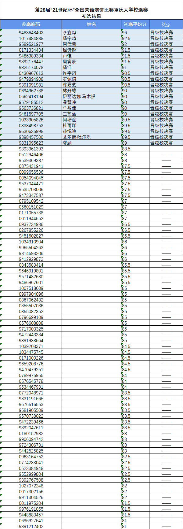 经报名资格初审、评委评定,现将第28届“21世纪杯”全国英语演讲比赛重庆大学校选赛初选结果及晋级校决赛名单公布如下。其他相关事宜,请选手在校初赛、校决赛群内获取。