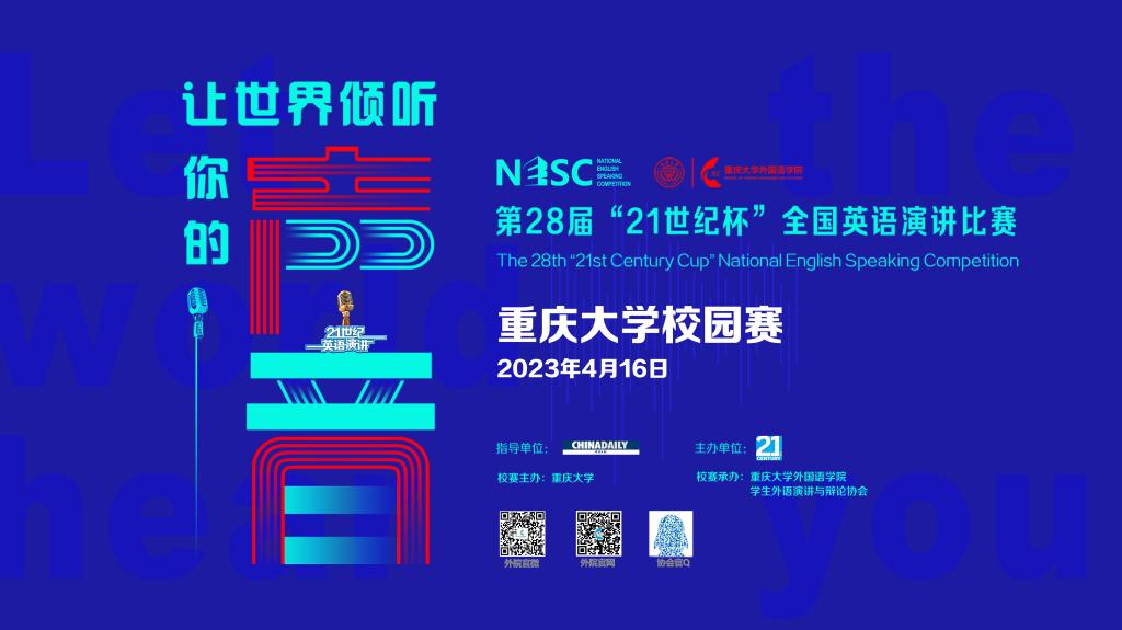 2023年4月16日,第28届“21世纪杯”全国英语演讲大赛重庆大学校选赛圆满收官。本赛事由中国日报社主办、21世纪英语教育传媒承办,赛事校选由重庆大学主办,澳门美高梅赌场-美高梅网上赌博