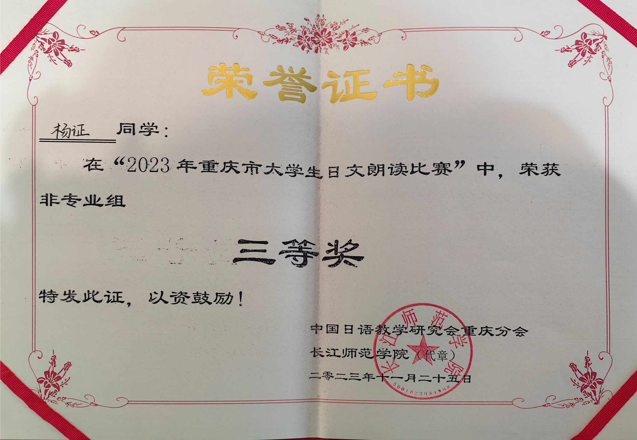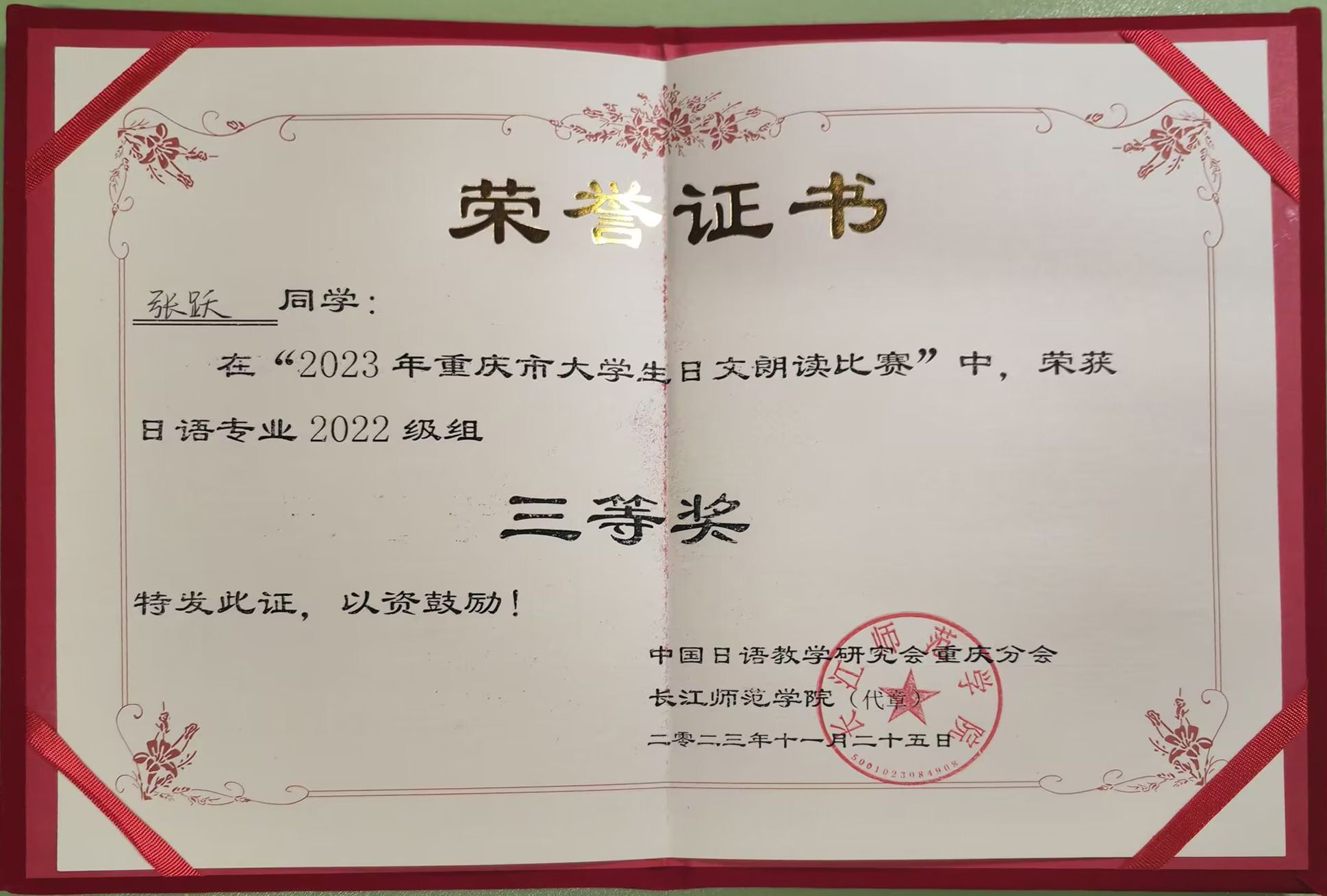 非专业组选手通过录制视频参赛,专业组成绩由自备稿朗读和现场即兴朗读两部分组成。经过激烈地角逐,日语专业吴笑恬同学获21级专业组一等奖,日语专业张跃同学获22级专业组三等奖,英语专业杨证同学获非专业组三等奖。