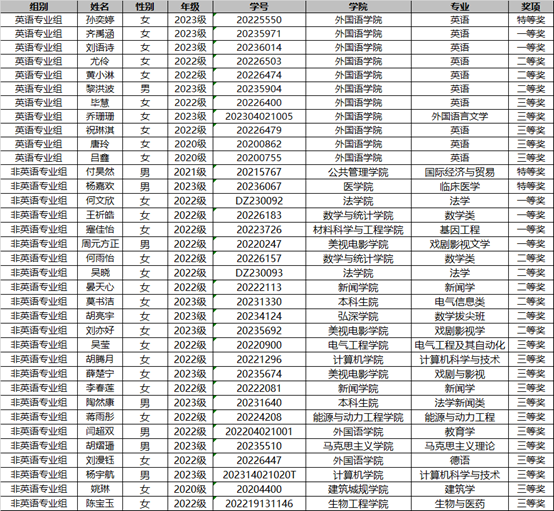 经过线上线下两阶段的激烈角逐,英语专业组评选出特等奖1名、一等奖2名、二等奖3名、三等奖5名,非英语专业组评选出特等奖2名、一等奖6名、二等奖8名、三等奖12名。