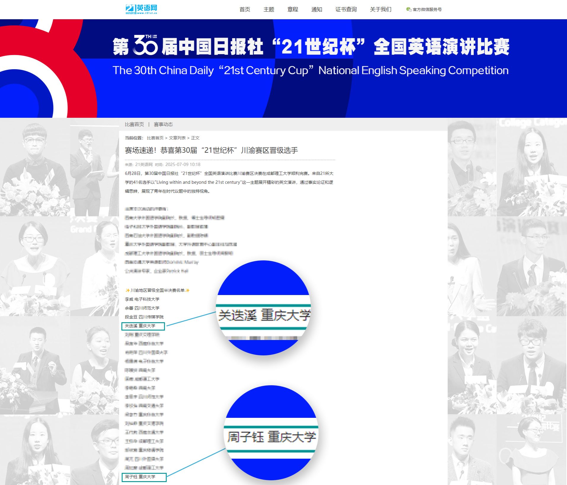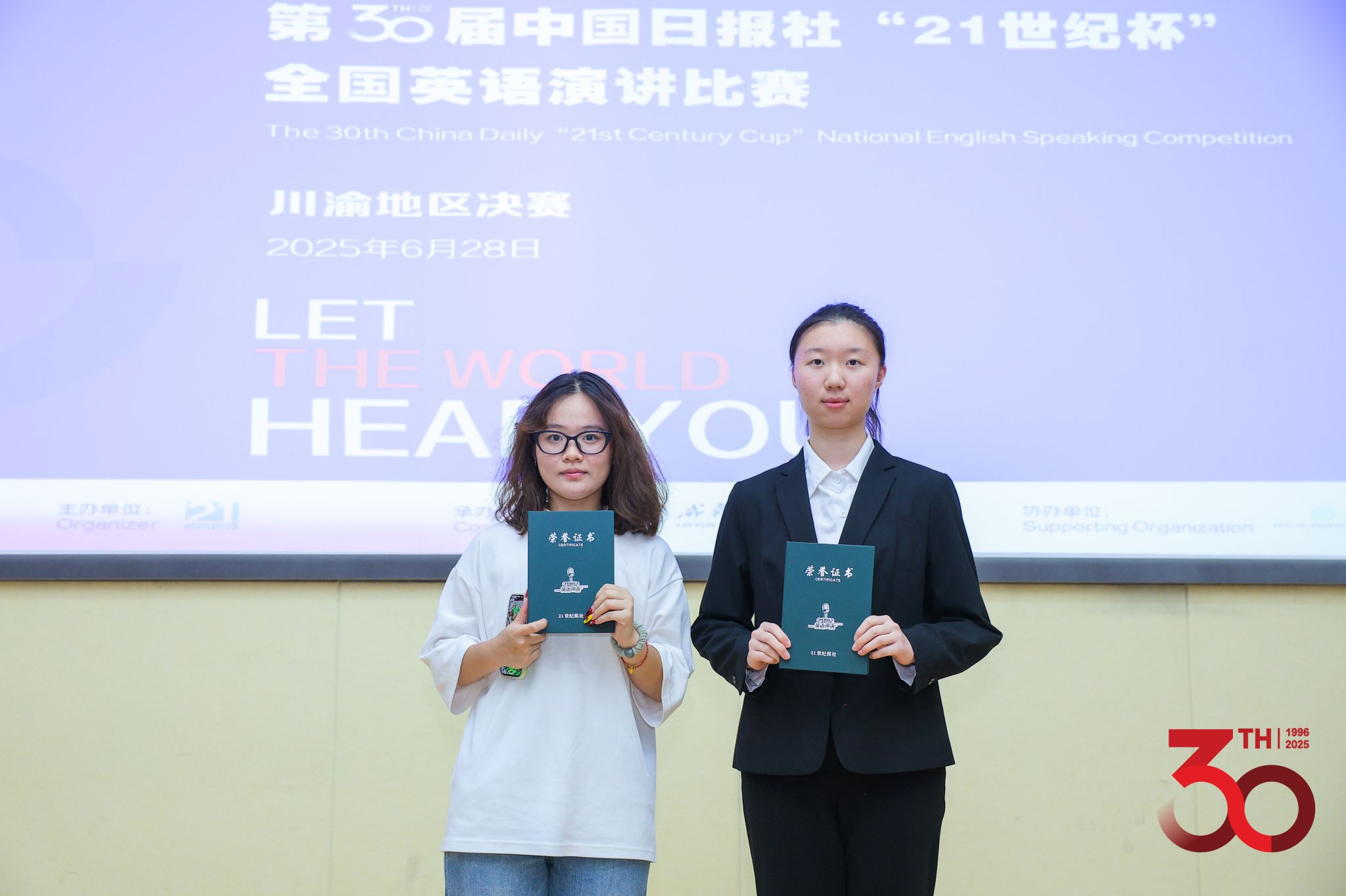 7月9日,第30届“21世纪杯”全国英语演讲比赛组委会正式公布了川渝赛区比赛结果:我校本科生院2024级环化健康类本科生关迭溪荣获一等奖,美视电影学院2024级戏剧与影视类本科生周子钰荣获二等奖,二人携手晋级国赛。