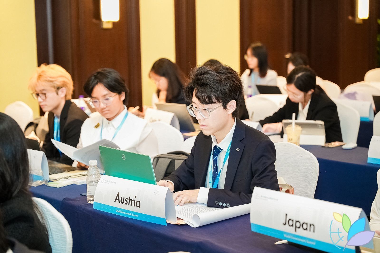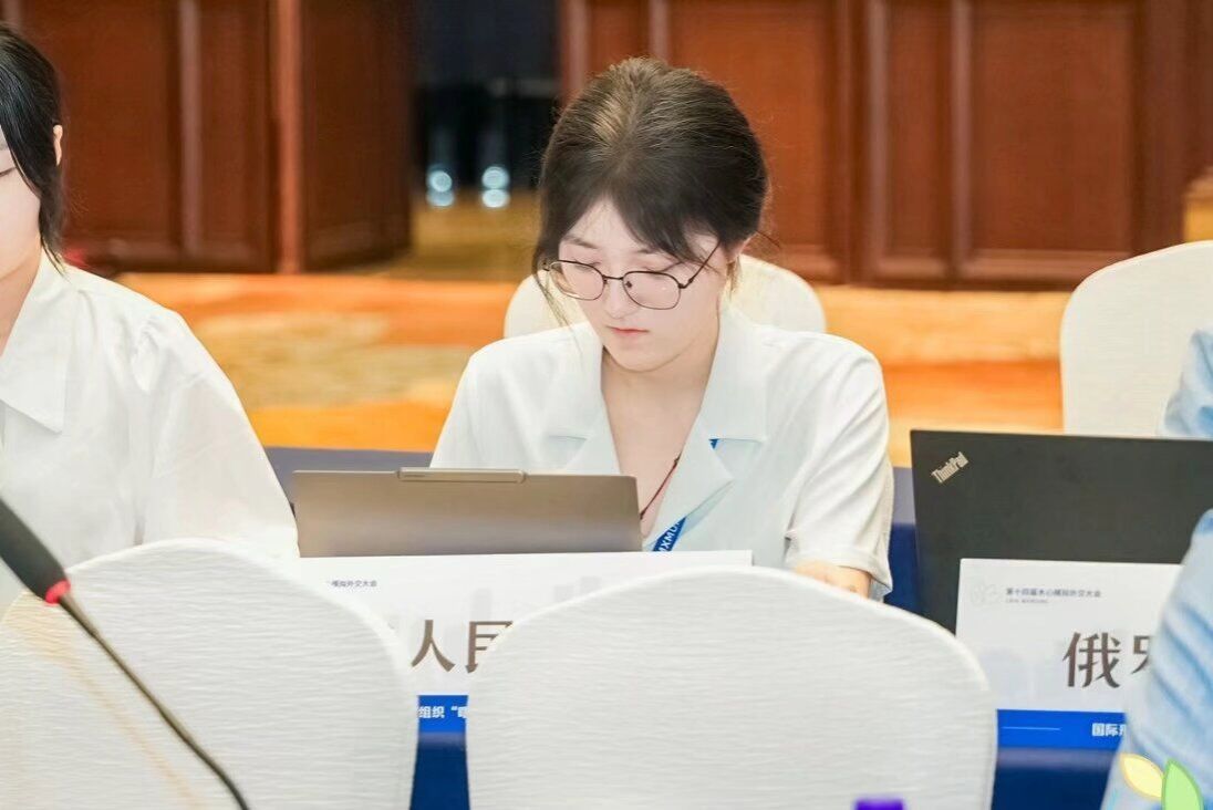 2023级英语专业丁雨暄和2024级英语专业刘沃忱在英文委员会World Governments Summit(世界政府峰会)会场里,分别以奥地利、日本、希腊代表的身份,围绕“以数字正义创设美好社会”议题,努力与其他发达国家达成协作,并与发展中国家开展“南北对话”,为共同推动全球数字技术公平发展与减少数字信息犯罪提供可行性方案。
