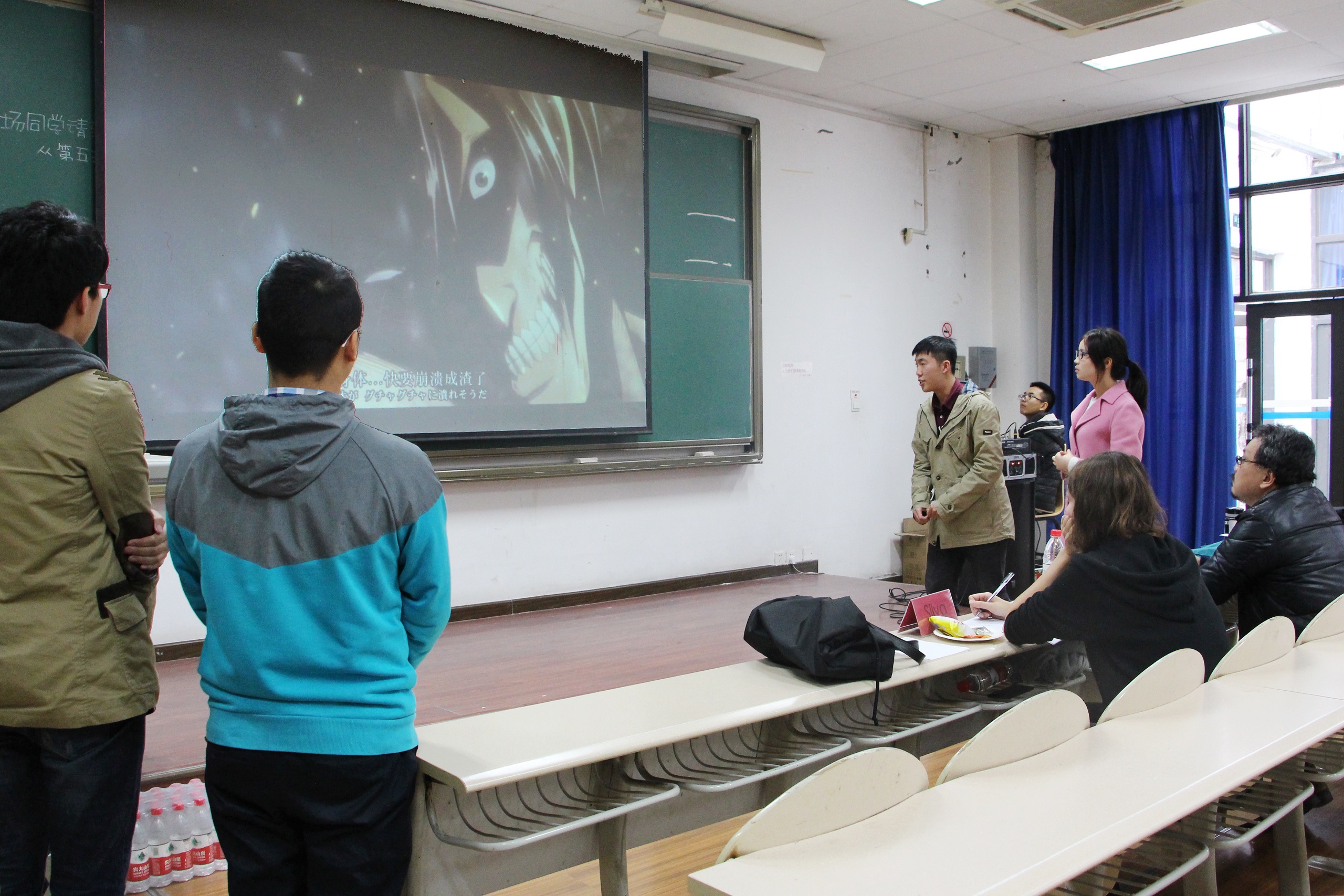 在日、德专业组决赛现场, 日、德专业各三小组共六支参赛队伍将进行最后的角逐。为《四月是你的谎言》配音的日语组胡壕婷、杨志、彭欣接脱颖而出,获得一等奖,德语组卢亦尧组及日语组杨凤组荣获二等奖,其余四组荣获三等奖。日语外教乡原章老师和德语外教Silva老师担任本次比赛的评委。