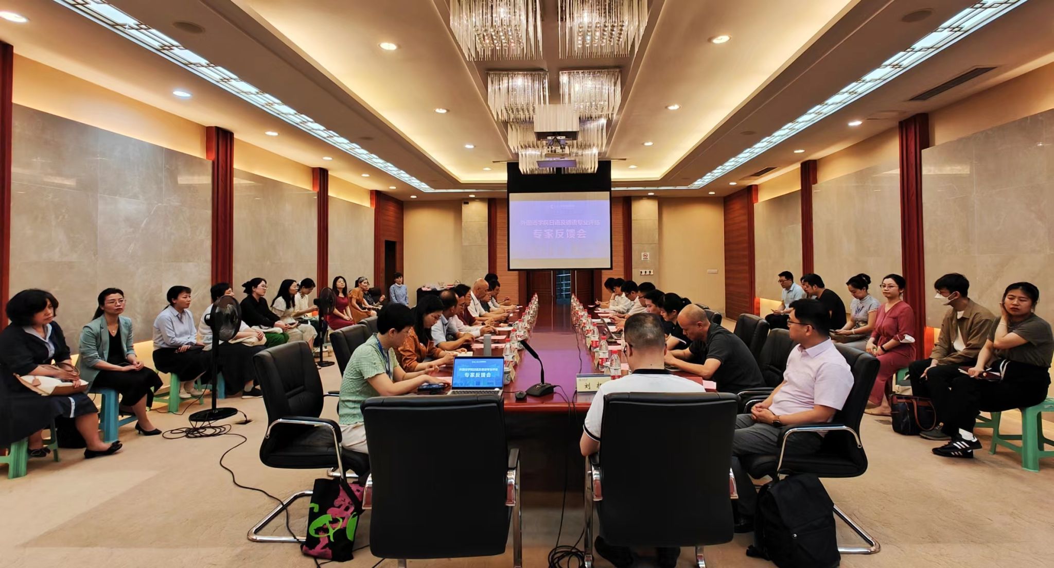 副院长王江主持。刘利国教授代表专家组发表了评审意见。专家组对日语专业生源质量、专业定位、培养计划、个性化培养等方面取得的成效给予了充分肯定。特别肯定日语专业建设亮点突出,双语培养模式契合新文科建设理念,培养成效显著;毕业论文指导双导师制度的创新,对培养学生的跨学科研究能力提供了新思路。最终评估考核成绩为优秀。同时,专家组也指出了日语系在专业培养目标定位、培养方案、教学与研究团队建设、成果评价体系等方面存在的不足,并提出了详细的整改建议。