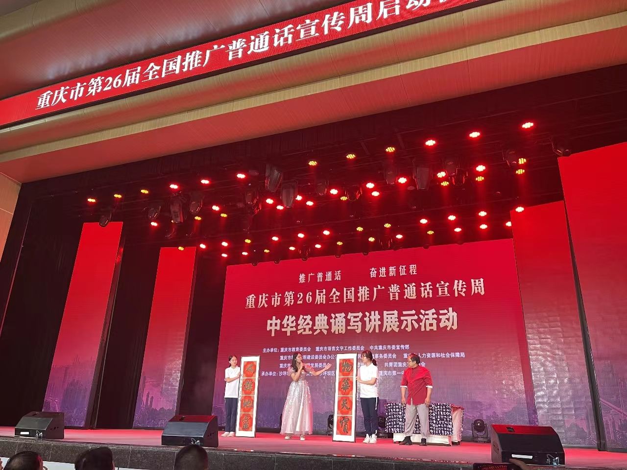 2023年9月12日,重庆市第26届全国推普周启动仪式暨现场展演活动在重庆市第一中学校举办。活动围绕全国推广普通话宣传周主题“推广普通话,奋进新征程”进行,其中有重庆市第九届中华经典诵读大赛颁奖典礼和节目表演。鲁芬同学上台领奖并现场朗诵,并作为唯一的留学生代表与重庆书法家合作,展现中国文化的魅力——朗诵与书法。