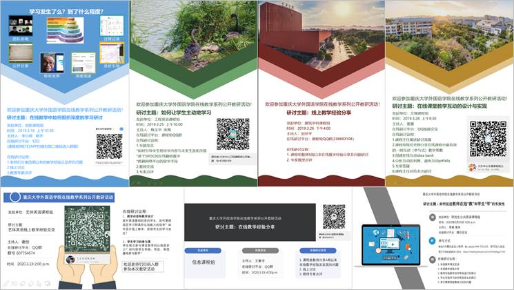 现已在中国大学MOOC和学堂在线上线《新大学英语·阅读与思辨》、《主题英语阅读》、《学术论文文献阅读与机助汉英翻译》、《商务英语翻译》4门在线开放课程,目前共计选课人数已超过11万人,在满足我校学生的学习需求之外,也服务于全国许多高校的学生和社会学习者,为他们提供优质学习资源。同时,有近60位老师已申请翻转课堂,在重庆大学SPOC平台上线数十门小规模在线课程。基于已有的在线课程资源和混合式教学经验,在此特殊时期,老师们依托多平台,设计多样的教学活动,能够快速适应线上外语教学,高效实现在线翻转课堂。
